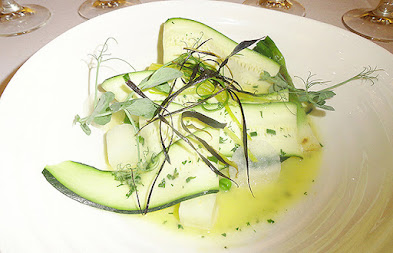 | Salade de lamelles de concombre, jus de poule, ciboulette |